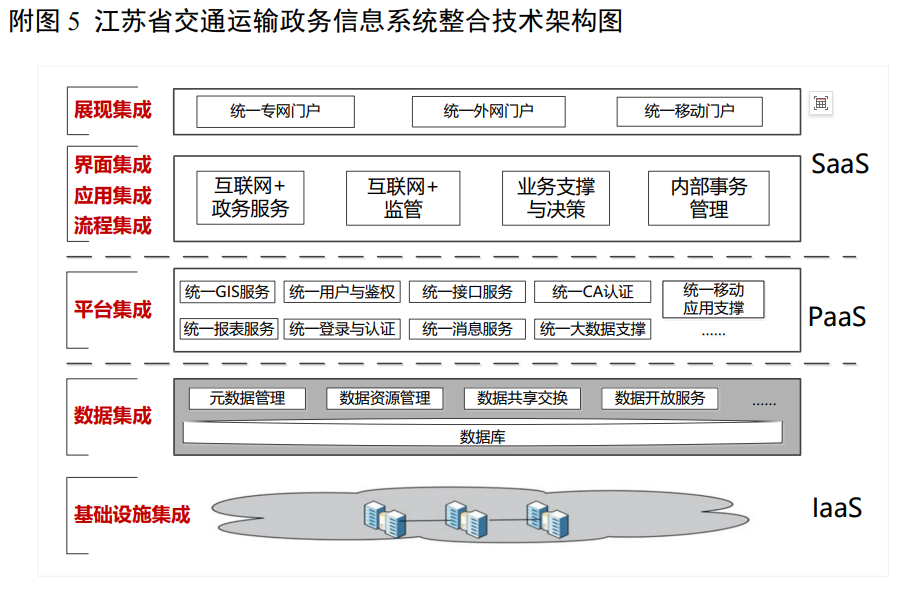 推动信息化基础资源整合。依托省市两级政务云平台架构部署行业数据中心,提供统一共享的基础设施云服务,推动政务信息系统全部上云,完善全省交通运输数据资源目录,打造完整规范的综合交通运输行业信息资源“总账本”。