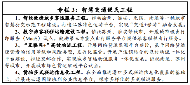 运输服务全链化。以出行链为核心打造数字化出行助手,规划发展村庄全部实现地图精准导航,完成城市交通领域出行即服务(MaaS)试点,提供一票/一码的市内全方式出行服务,以南京、苏锡常、徐州都市圈等为重点完成区域间旅客联程试点,推广全程“一站式”服务。提供跨方式、跨区域的全程物流信息服务,多式联运信息化覆盖70%的沿江沿海以及重点内河港口,集装箱运输电子运单使用率超过85%,实现全程“一单制”服务。