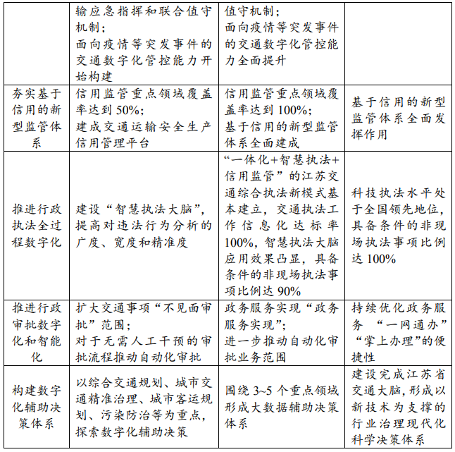 行业治理精准化。信息系统整合全面完成,行业治理数字化转型成效显著,全域监测和协同管控能力稳步提升,运输生产标准化能力全面构建,安全风险感知和化解能力大幅增强,以信用为基础的新型监管体系初步建成,“一体化+智慧执法+信用监管”的交通运输综合执法新模式基本建立,政务服务实现“网上办、掌上办、一次办”,围绕重点领域形成大数据辅助决策体系。