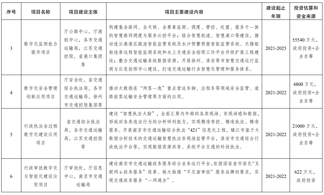 基础设施数字化。完成一批智慧公路、智能铁路、智慧航道、智慧民航、智慧港口和智慧综合枢纽等智慧交通基础设施建设。推动新建、改扩建高速公路和普通国省道公路同步开展智慧公路建设,实现“增量”提质升级,同时以沿江地区、苏南片区、南京都市圈等为重点,完成存量公路智慧化升级1200公里以上,实现“存量”挖潜增效,并在约200公里道路上实现车路协同。以推动京杭运河江苏段走在全国内河航运发展前列为重点,完成京杭运河江苏段全线智慧航道建设,存量航道智慧化升级达到700公里以上,并在重点航段实现有人干预下的船舶自主航行示范。